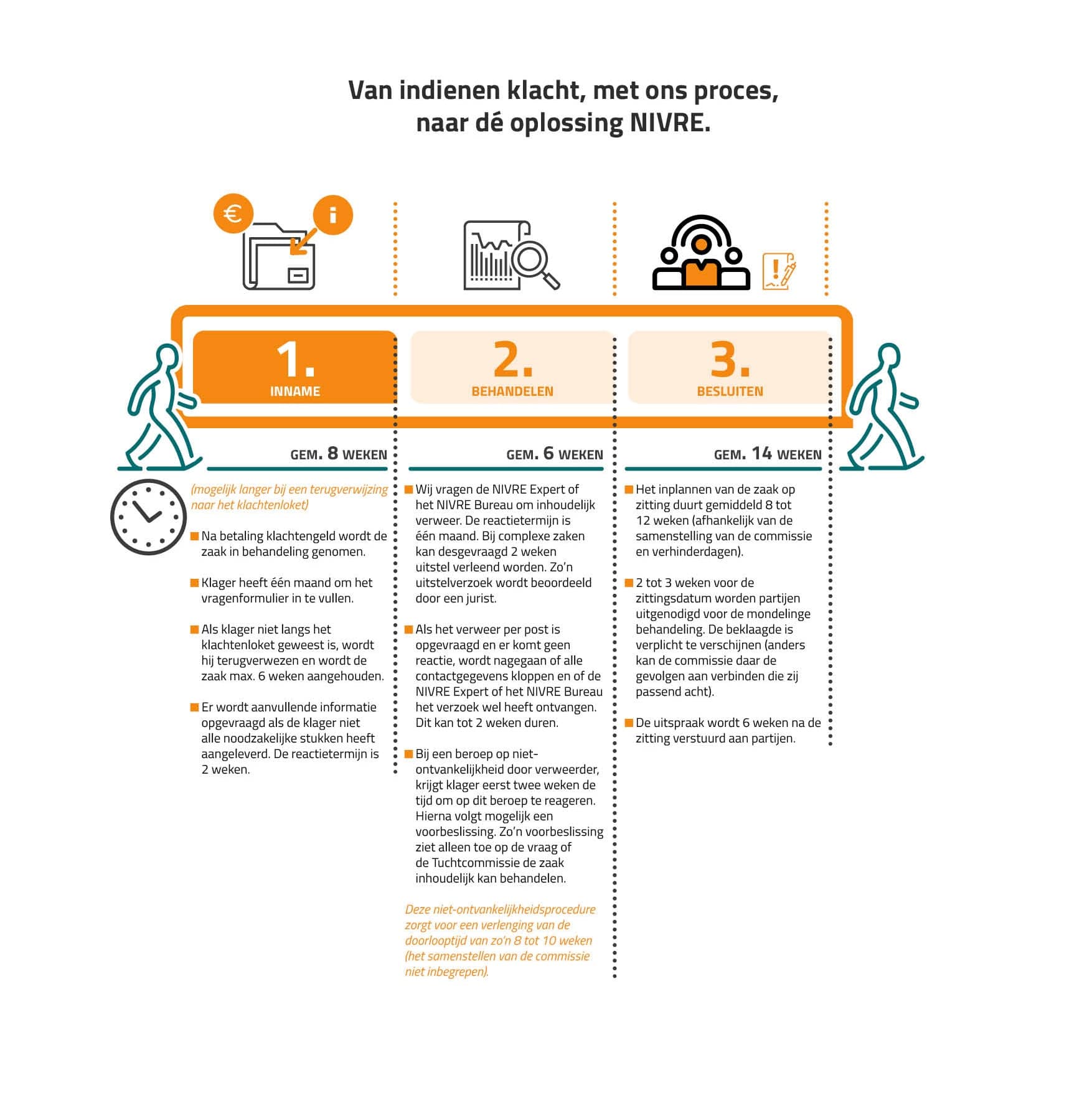Bij de Tuchtcommissie NIVRE gelden andere termijnen dan bij de geschillencommissies. Hieronder nemen wij u stapsgewijs mee in het proces van de tuchtcommissie, met een overzicht op hoofdlijnen en bijbehorende tijdslijn.